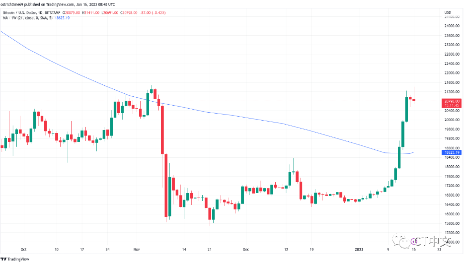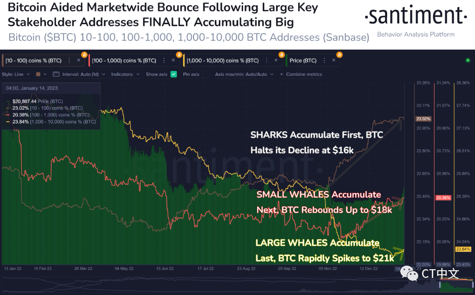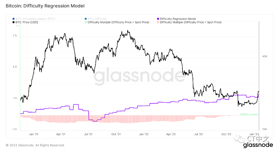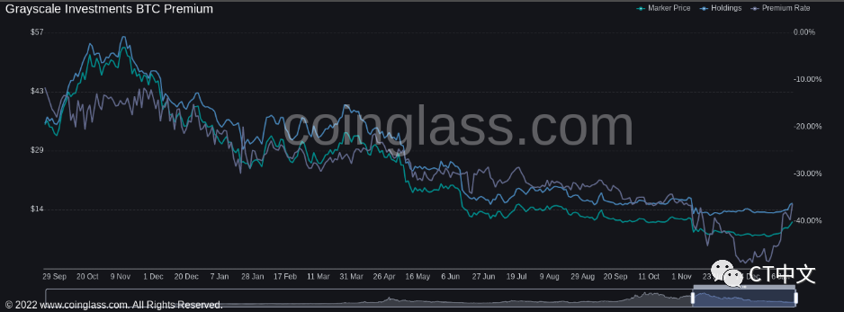 在机构利益恢复的话题上,另一个追回其FTX全部损失的图表是最大的比特币机构投资工具,灰度比特币信托(GBTC)。Coinglass的数据显示,截至1月13日(有数据可查的最新日期),GBTC份额的交易价格较资产净值(NAV)折价36.26%。这种折价,以前是正值,被称为“GBTC溢价”,自12月底以来一直在走高,现在比FTX崩溃以来的任何时候都要高。它有史以来最大的读数是在那之前,当时它达到48.62%,因为灰度受到了母公司Digital Currency Group(DCG)自己的FTX麻烦的影响。这种争议仍在继续,通常是公开的,但GBTC出现了几个月来最令人鼓舞的结果。与此同时,在幕后,灰度继续与美国监管机构斗争,因为他们拒绝允许其将GBTC转换为基于比特币现货价格的交易所交易基金(ETF)。在1月13日的推特更新中,灰度首席法律官Craig Salm多次提到该公司的 "承诺",即赢得其案件并将第一个现货比特币ETF带到美国市场。他总结道:“重申一下,将GBTC转换为比特币现货ETF是跟踪比特币价值的最佳长期方式。”我们的案子正在迅速推进,我们有强大的、常识性的和令人信服的法律论据,我们乐观地认为法院应该会做出有利于我们的裁决。GBTC溢价 vs 资产持有量 vs BTC/USD图表 来源:Coinglass