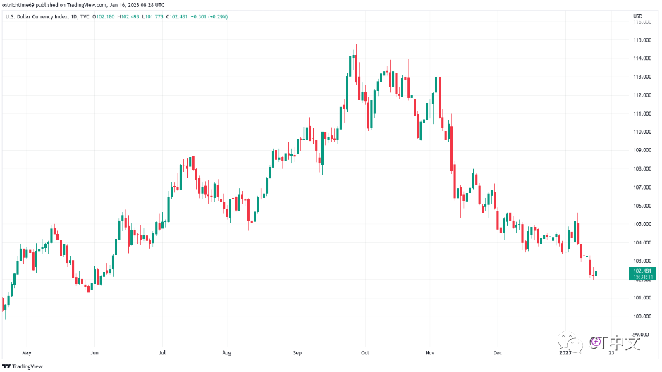 之前的一篇文章补充说,鲸鱼活动确实有助于提振交易所市场。与此同时,交易账户Stockmoney Lizards关注了FTX损失的逆转,称在当前水平上会进行“一点(横向)盘整”。交易公司Eight的创始人兼首席执行官Michal van de Poppe表示,由于美元走强的变化,比特币确实可能会盘整。当天,美元指数(DXY)仍接近2022年6月初以来的最低水平,触及107.77。美元指数(DXY) 1日蜡烛图 来源:TradingView