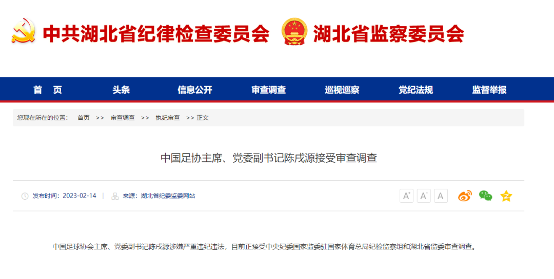 据湖北省纪委监委网站2月14日消息,中国足球协会主席、党委副书记陈戌源涉嫌严重违纪违法,目前正接受中央纪委国家监委驻国家体育总局纪检监察组和湖北省监委审查调查。